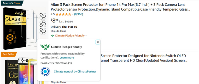 有气候友好承诺认证的产品,在搜索页面展示时会取得一个环境友善标签(如图),也就是 气候友好标签。买家点击该标签后还能详细查看该产品的认证类型。